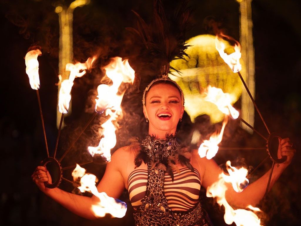 The main stage, set over the pool, became the heart of the evening, bringing together an international line-up of performers. World rhythms flowed throughout the night with DJ Elaiva, vibrant saxophone interludes by Sharif, and live sets from Australia’s Hamilton Band. Visual theatre unfolded as acrobats, aerialists, and fire-led performances by Fiesta Creations created stunning displays of movement and light, while cultural dance moments invited guests to join in. Sid, the emcee, guided the celebration with warmth and charm.