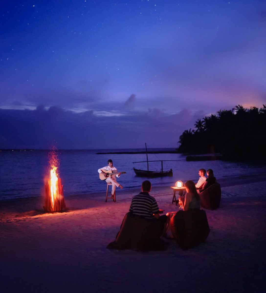 On the surface, Riyaa Watersports introduces guests to windsurfing, catamaran sailing, stand-up paddleboarding, and kayaking. Snorkelling excursions, traditional handline fishing, and sailing aboard a restored riyaa dhoni connect visitors with Maldivian maritime heritage. Evenings bring island rituals to life with Movie Under the Stars, sunset dhoni cruises for two, and weekly Beach Bonfire Nights featuring live music and relaxed island gatherings.